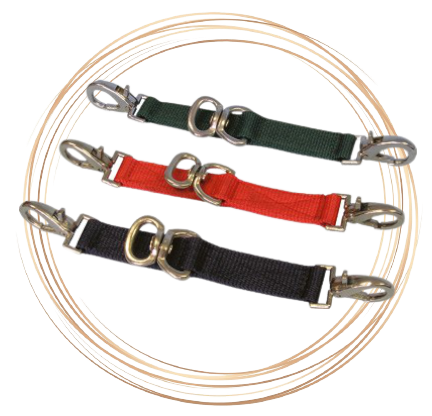 Nylonové lonžovací brýle. S dvěmi nerez karabinami pro připnutí k udidlu a jedním nerez očkem s obrtlíkem pro připnutí lonže.