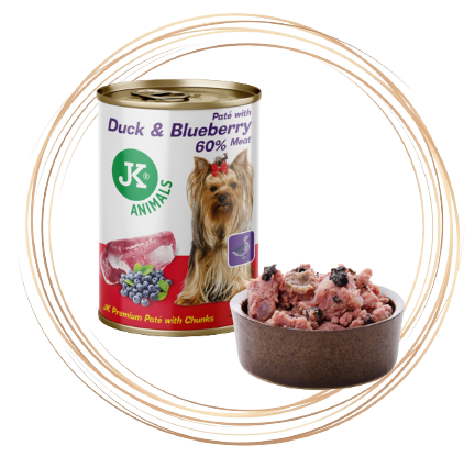 60 % maso a vedlejší produkty živočišného původu - játra, srdce (16 % kachna), 34 % vývar, 5 % borůvky, 1 % minerály.
